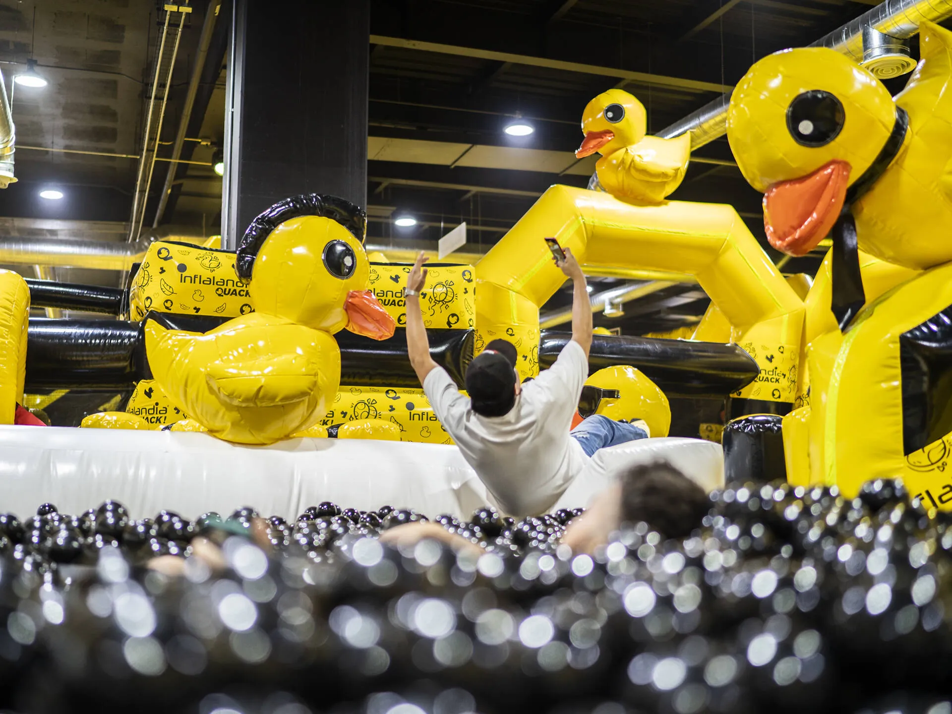 Las instalaciones cuentan con inflables que llegan hasta los muros, ideales para escalar o al menos intentarlo. También hay albercas de pelotas y retos, intenta pasar de una plataforma a otra sin caerte o cuélgate de una barra para ver cuántos segundos puedes aguantar. Por supuesto, los patos inflables se encuentran por todas partes.